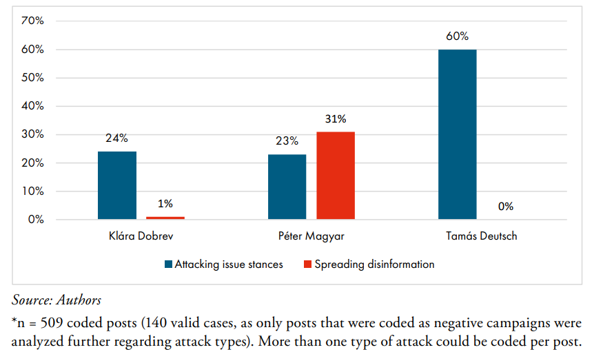Two main types of negative campaigning emerged (see Figure). Attacks on issue stancfes—especially related to the war in Ukraine—were most typical of Deutsch’s communication. In contrast, accusations of spreading disinformation appeared almost exclusively in Magyar’s campaign, reflecting his response to personal and political attacks. Personal attacks on credibility and integrity were present across all candidates, with no significant differences between them.